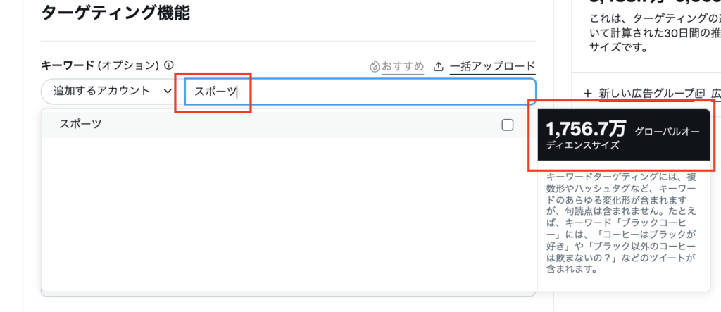 入力欄にキーワードを入力すると、推定のオーディエンスサイズが表示されます。