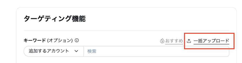 「一括アップロード」機能を使って入稿する場合、推定のオーディエンスサイズは表示されません。そのため、キーワード毎のオーディエンスサイズを確認したい場合は「一括アップロード」機能を使わずにキーワードを入稿しましょう。