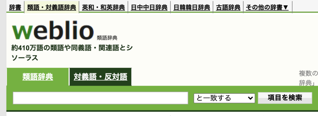 無料の「Weblio類語辞典」を使うことで、類語や同義語を洗い出し、他の言い回しや似たような言葉の有無を確認できます。