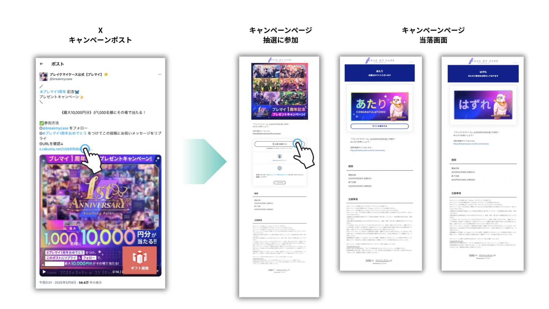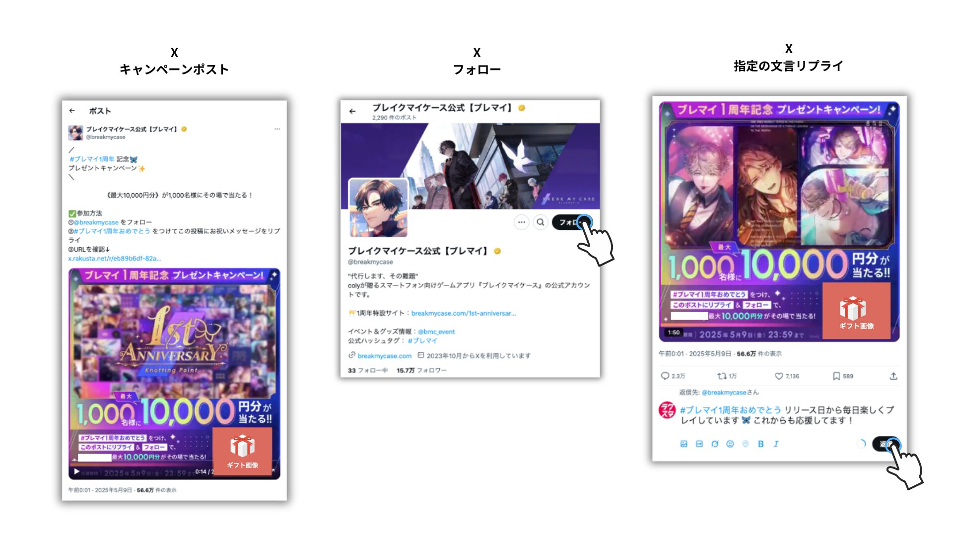 「#ブレマイ1周年おめでとう」+「お祝いメッセージ」をつけたリプライを参加条件に設定。